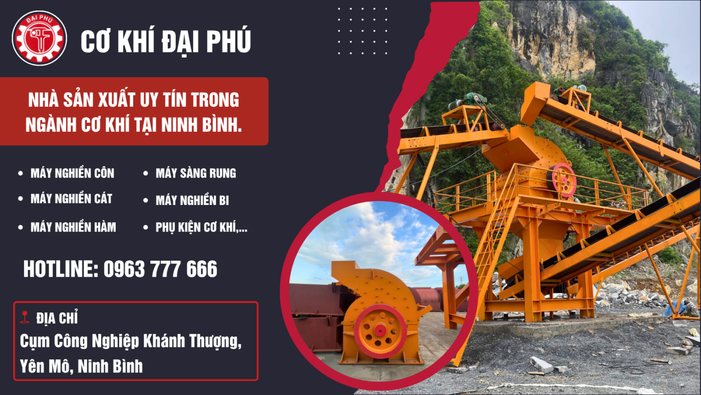Cơ Khí Đại Phú tự hào là đơn vị tiên phong và uy tín trong ngành cơ khí tại Ninh Bình. Với kinh nghiệm lâu năm trong lĩnh vực sản xuất và cung cấp các thiết bị cơ khí, chúng tôi cam kết mang đến cho khách hàng những sản phẩm chất lượng cao, đáp ứng đầy đủ các yêu cầu về kỹ thuật và công năng. Chúng tôi cung cấp các loại máy nghiền, máy sàng rung, máy nghiền bi, và phụ kiện cơ khí với độ bền cao và hiệu suất ổn định.
