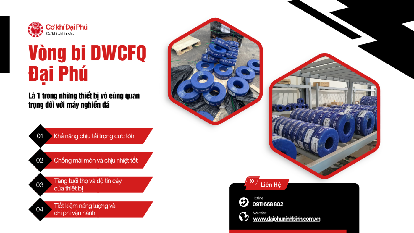 Vòng bi DWCFQ Đại Phú là một sản phẩm chất lượng cao, không thể thiếu trong các dây chuyền máy nghiền đá. Với thiết kế tối ưu và các tính năng vượt trội, vòng bi DWCFQ Đại Phú giúp nâng cao hiệu suất hoạt động, giảm thiểu sự cố và tiết kiệm chi phí bảo trì cho các doanh nghiệp. Đặc biệt, vòng bi này đáp ứng được yêu cầu khắc khe của môi trường làm việc trong ngành công nghiệp khai thác đá, giúp bảo vệ máy móc, đảm bảo sản xuất ổn định và lâu dài.